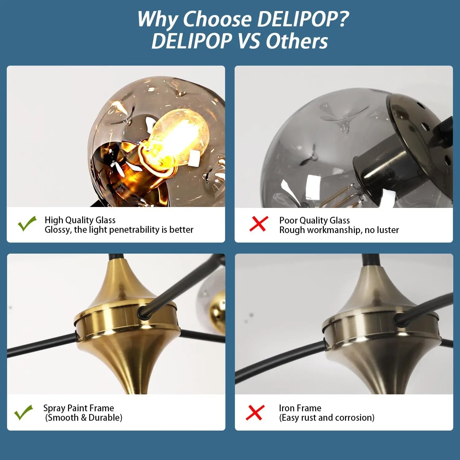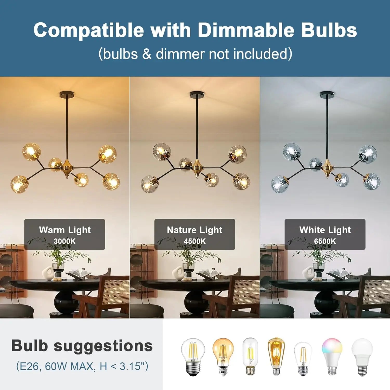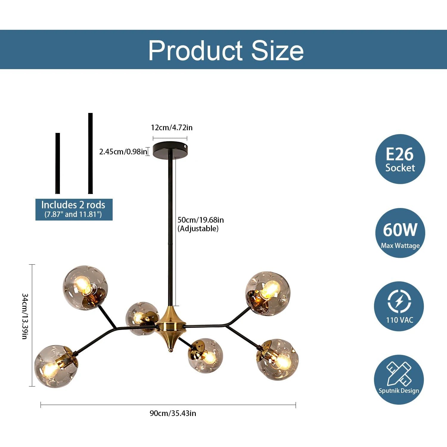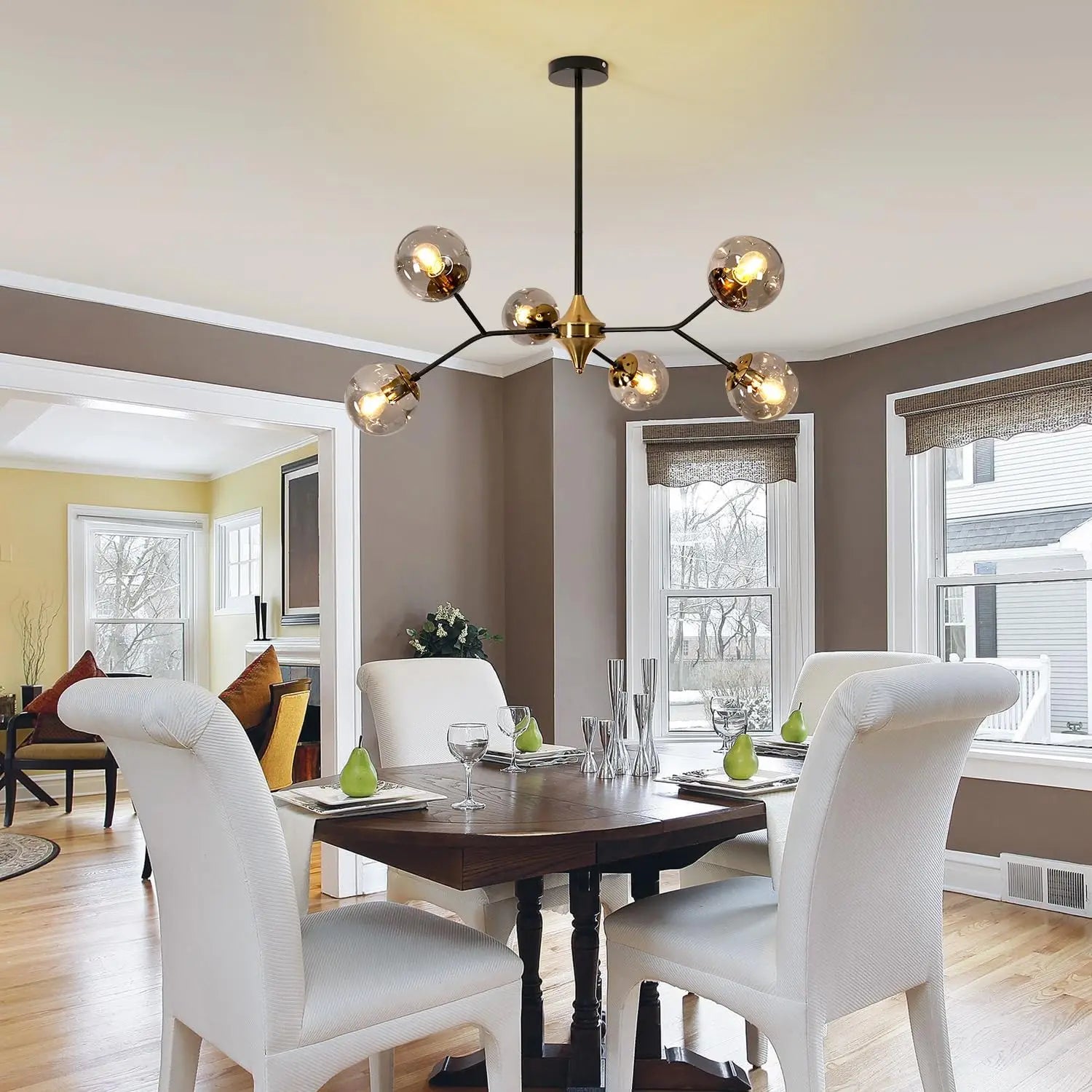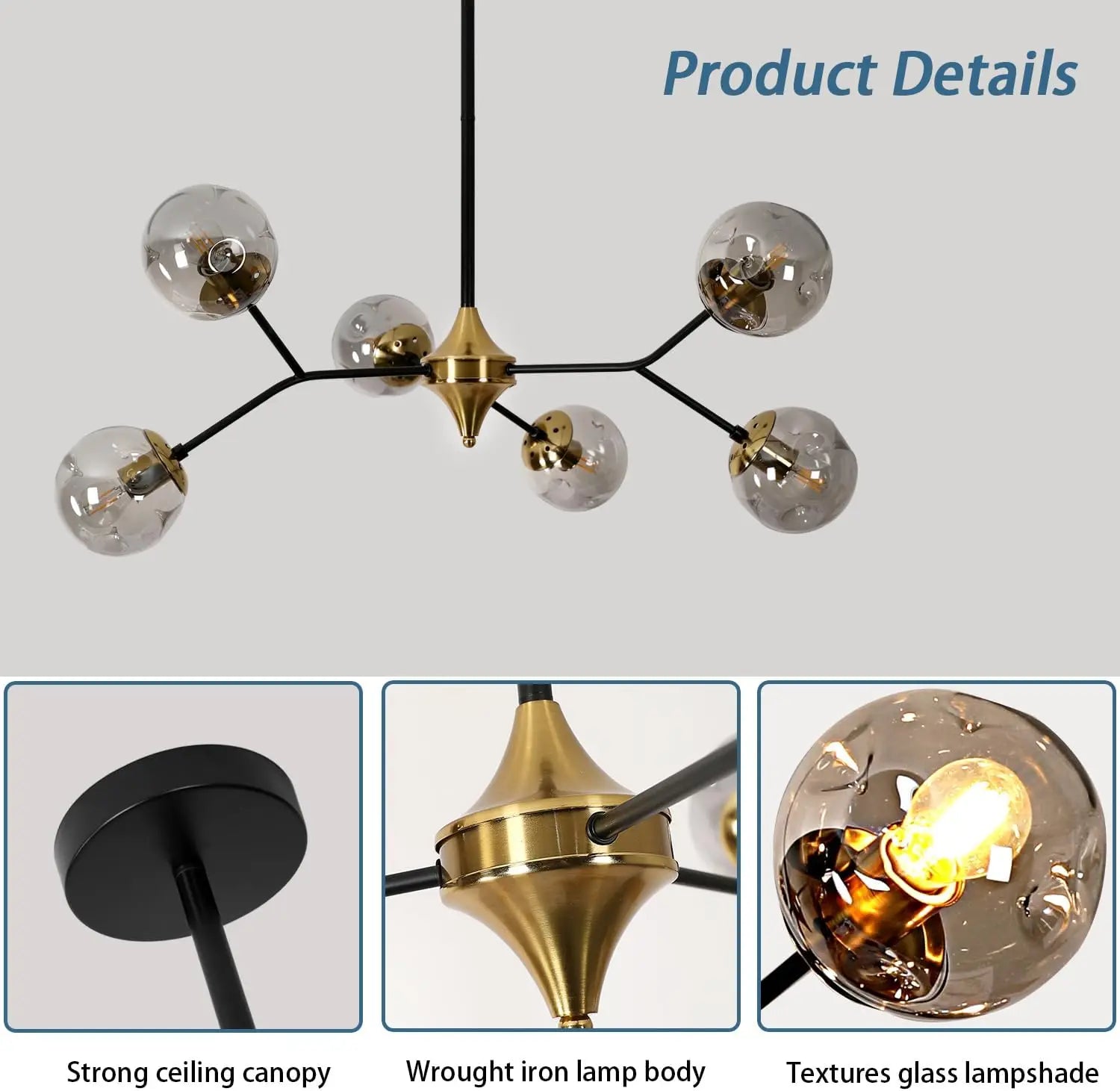 Glass Sputnik Chandelier, 6-Light Black and Gold with Smoke Gray Glass Lampshade Chandelier, E26 Mid Century Modern Pendant Ligh